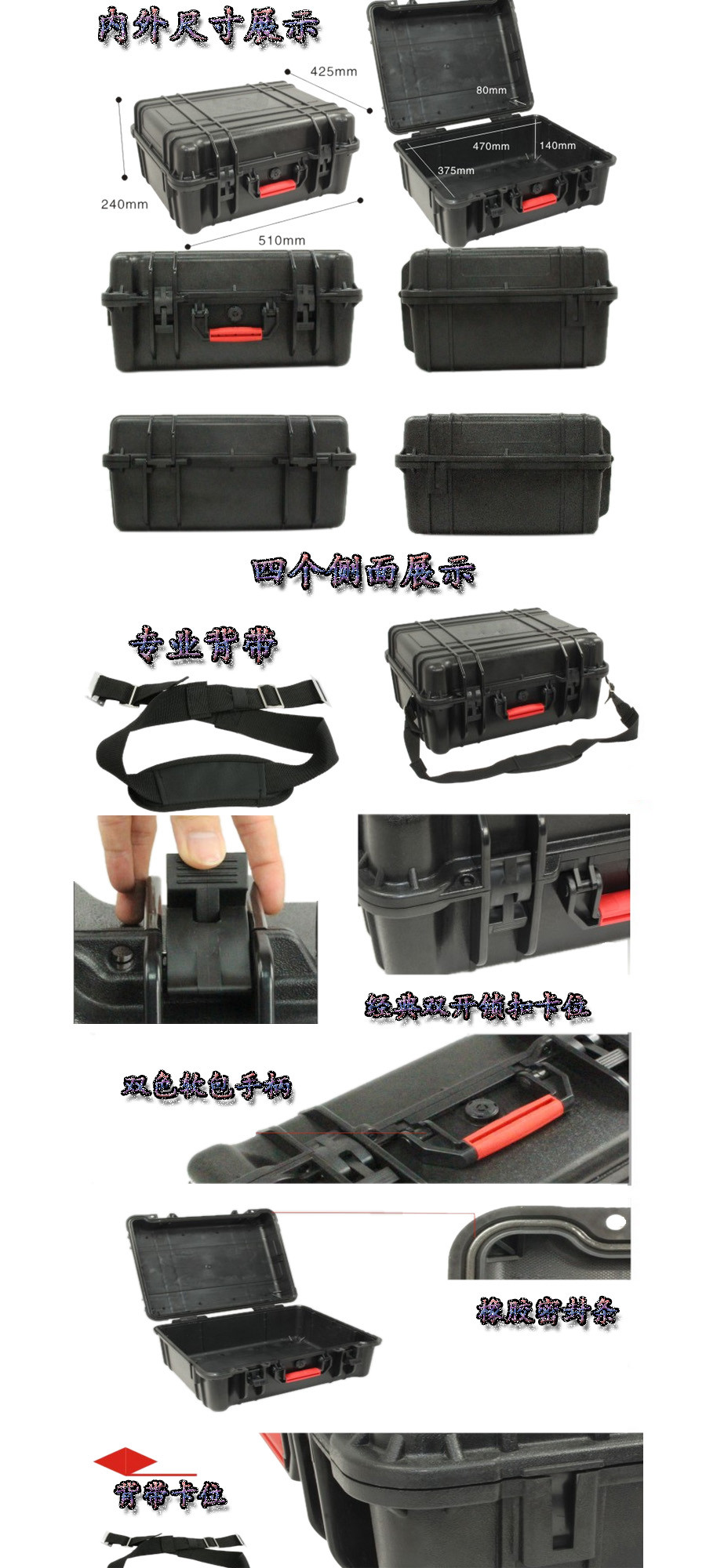 简要说明:广泛用于传媒、公安、消防、军队、航空、户外摄影、野外考察、科学探测等众多领域的高端仪器、仪表。具有高强度、高抗压冲击、防潮、绝对密封、防尘、防水等特点。产品材质:ABS原料,箱体采用高抗冲击的高分子聚合材料一体注塑成型,密封采用扁型弹性发泡密封橡胶条,确保防水气密,所有较轴均采用不锈钢材质。